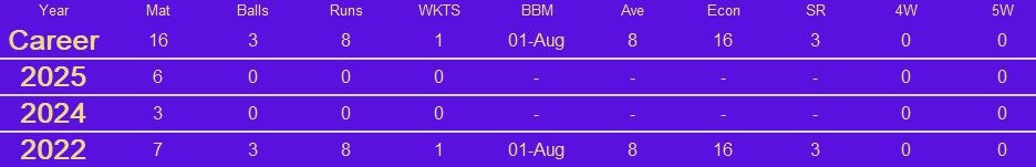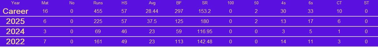 Hailing from South Africa, Dewald Brevis is an explosive right-handed batter known for his attacking style and ability to strike the ball hard and long. Often compared to AB de Villiers for his stroke play, Brevis earned the nickname ‘Baby AB’ early in his career. He has featured in 81 T20s, scoring 1787 runs with a highest of 162, and represented South Africa in two T20Is in 2023. He also brings IPL experience, having played for Mumbai Indians in 2022 and 2024. Now, in another significant step in his young career, the 21-year-old has been signed by Chennai Super Kings for INR 2.2 Crores for TATA IPL 2025 as a replacement for Gurjapneet Singh. With the chance to share the dressing room with the likes of MS Dhoni and Devon Conway, Brevis’ power-hitting could prove vital for CSK, especially in the powerplay.