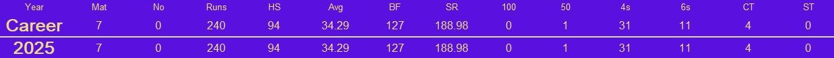 Ayush Mhatre is a bright and young right-handed batter from Mumbai. He made his mark in the India Under-19 setup with three appearances at the 2024 Asia Cup. However, it was in the first-class circuit where he truly turned heads. He debuted in the Irani Cup last year with a stellar 176 against Maharashtra—led by Ruturaj Gaikwad—after a composed 52 on a turning track against Baroda in Vadodara. In his nine first-class appearances so far, Mhatre has scored 504 runs, including two centuries, at an average of 31.50. His List A record is even more impressive: 458 runs in seven innings at an average of 65.42 and a strike rate of 135.50. His century against Nagaland also saw him break Yashasvi Jaiswal’s world record, becoming the youngest player to score 150+ in men’s senior List A cricket. The 17-year-old earned his maiden IPL contract when Chennai Super Kings signed him as a replacement for Ruturaj Gaikwad for INR 30 lakhs ahead of IPL 2025. Sharing the dressing room with stalwarts like MS Dhoni, Ravindra Jadeja, Ravichandran Ashwin etc, is set to be a golden opportunity that promises to boost his game and accelerate his development.