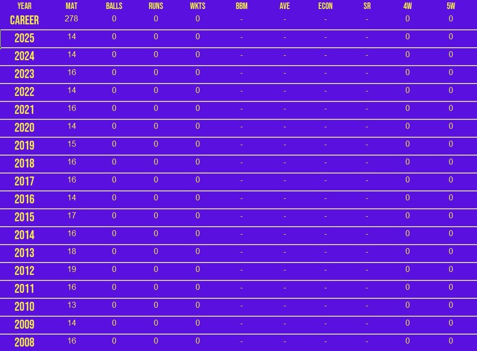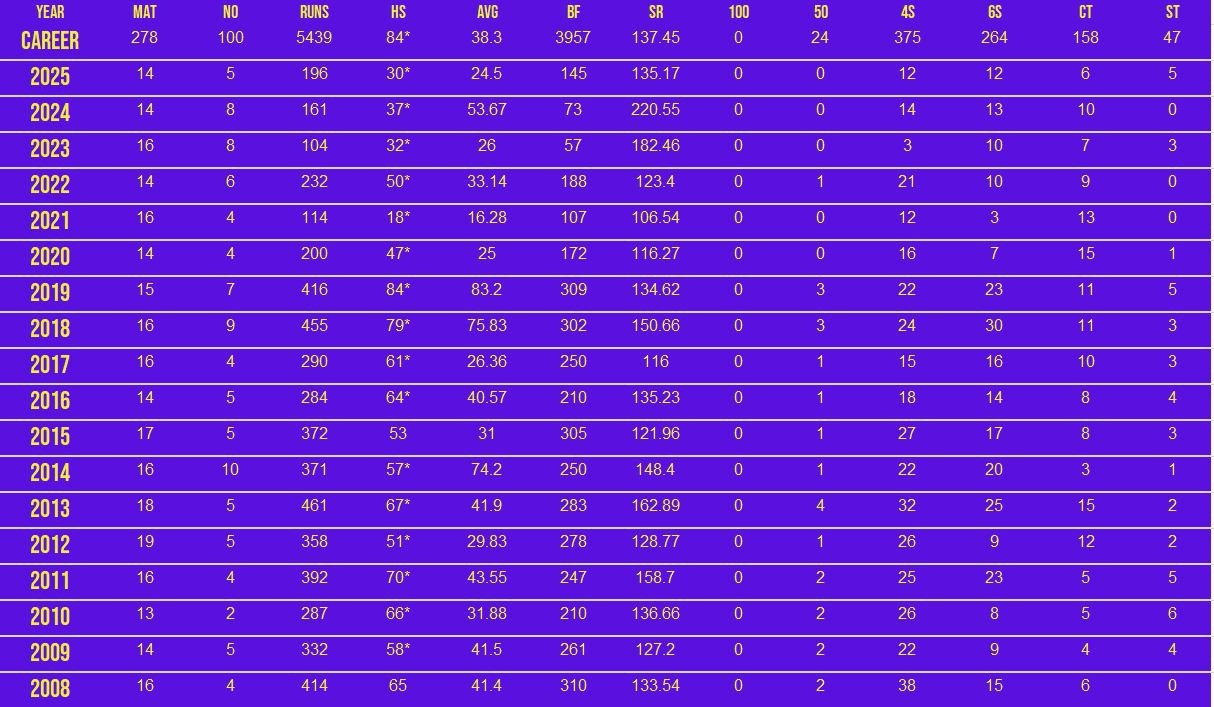 A living legend of the game, MS Dhoni will once again don the CSK jersey in TATA IPL 2025. The five-time IPL-winning captain, known for his calm demeanour and astute leadership, continues to be a pillar of strength for the franchise. Dhoni has amassed over 5000 runs and effected close to 200 dismissals behind the stumps. While his role as a batter has evolved over the years, his ability to finish games remains unmatched. Retained as an uncapped player, the CSK talisman will be crucial both as a mentor and a player as the franchise aims for a record sixth IPL title.