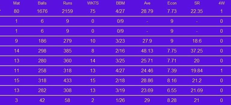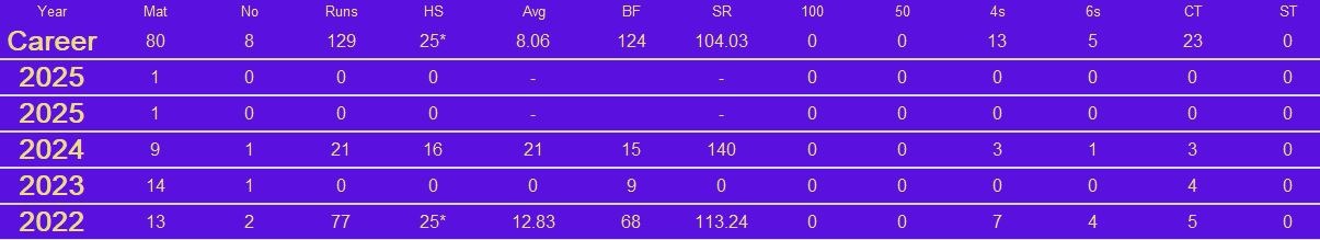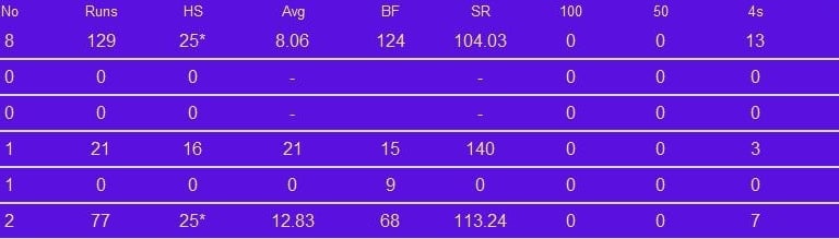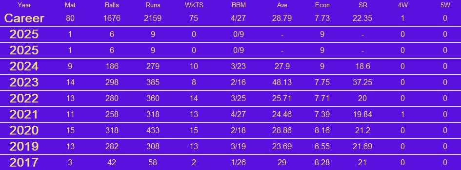 Rahul Chahar was a key member of Mumbai Indians' two IPL title-winning sides at the end of the 2010s. He took 28 wickets in the wins in 2019 and 2020. The year after he did just as well, taking 13 wickets and finishing as their second most prolific wicket-taker. He was bought by Punjab Kings in 2022 but his numbers off in the three seasons he spent there. He was picked up by Sunrisers Hyderabad for IPL 2025, where he is one of the two specialist legspinners alongside Adam Zampa.